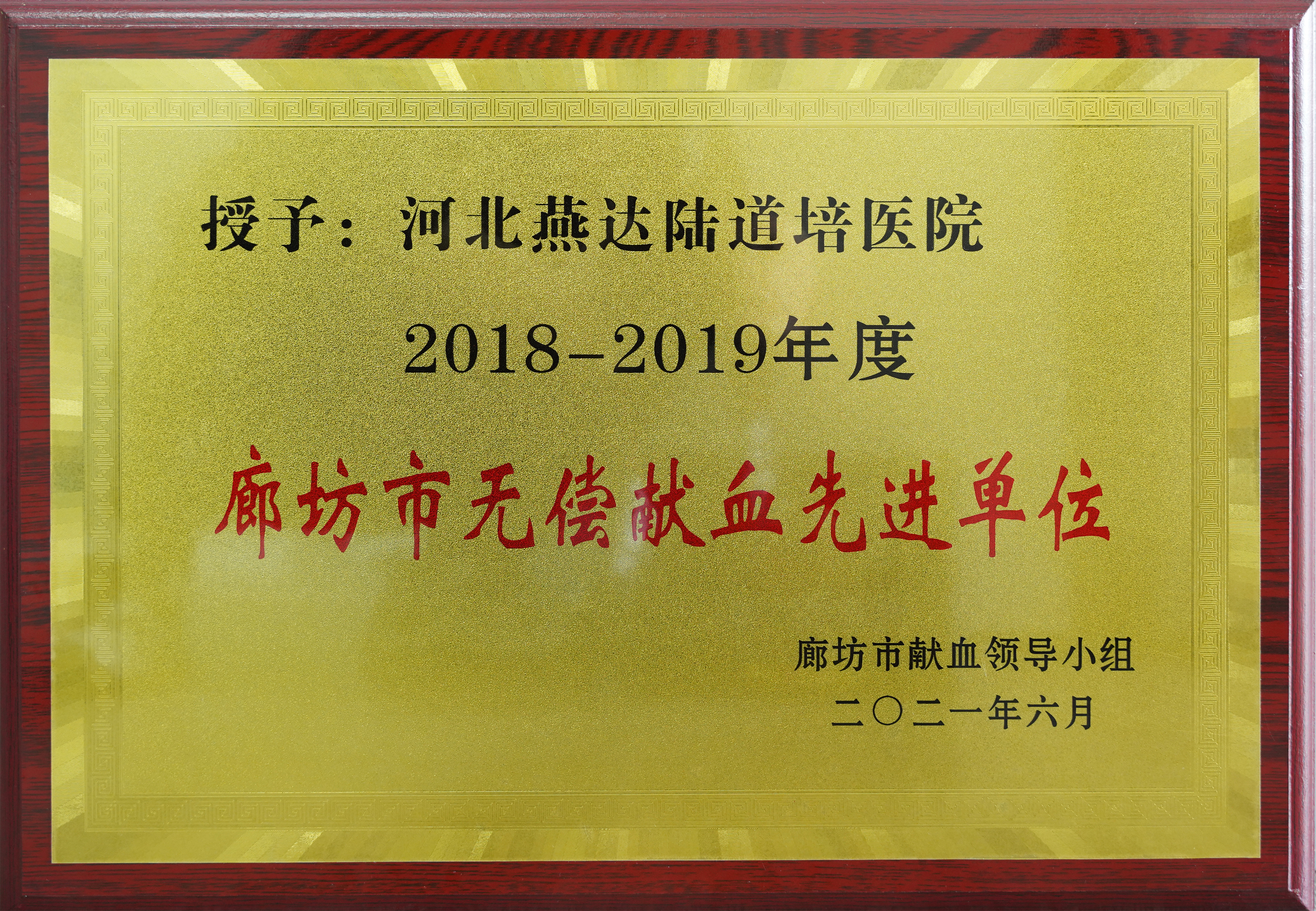 經(jīng)廊坊市獻(xiàn)血領(lǐng)導(dǎo)小組評(píng)定,授予燕達(dá)陸道培醫(yī)院“2018-2019年度廊坊市無(wú)償獻(xiàn)血先進(jìn)單位”光榮稱號(hào)。