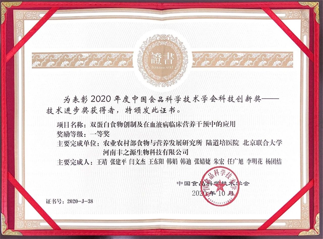 “雙蛋白食物創(chuàng)制及在血液病臨床營養(yǎng)干預中的應用”項目獲得2020年度中國食品科學技術(shù)學會科技創(chuàng)新獎-技術(shù)進步一等獎。